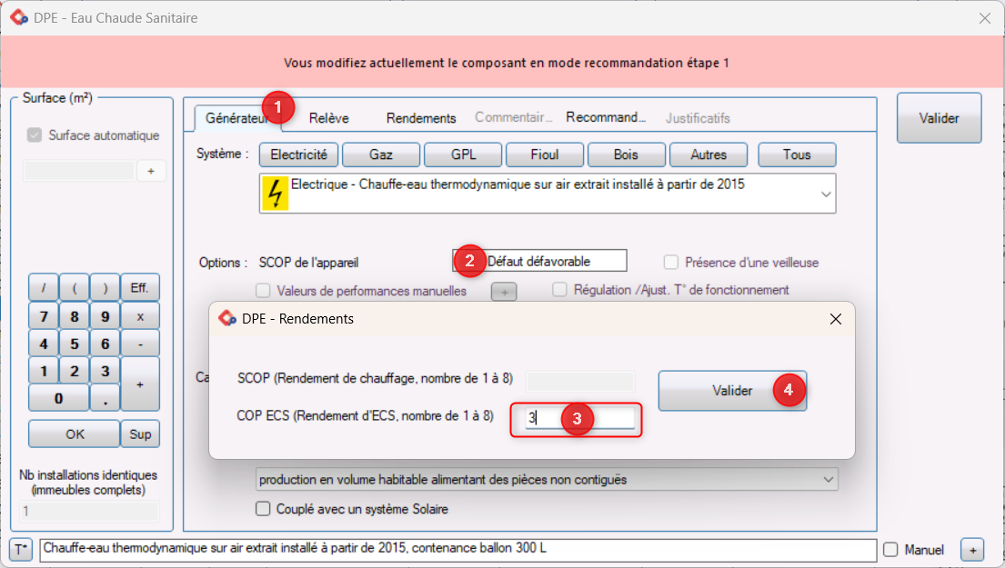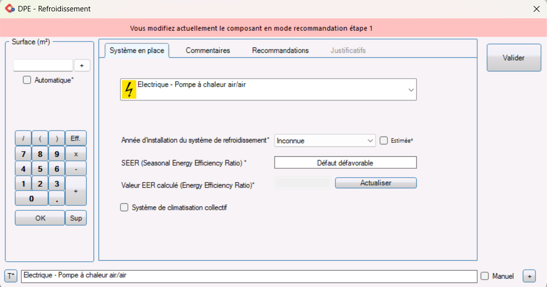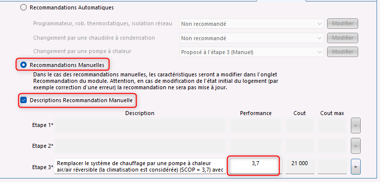 En premier lieu, bien passer la recommandation de la PAC air/air en ''Recommandations manuelles'', ne pas laisser en automatique et remplir la case ''Performance'' avec le SCOP :