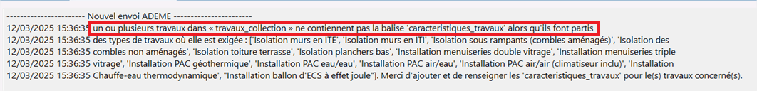 EXEMPLE : un ou plusieurs travaux dans « travaux_collection » ne contiennent pas la balise 'caracteristiques_travaux' alors qu'ils font partis des types de travaux où elle est exigée : ['Isolation murs en ITE', 'Isolation murs en ITI', 'Isolation sous rampants (combles aménagés)', 'Isolation des combles non aménagés', 'Isolation toiture terrasse', 'Isolation planchers bas', 'Installation menuiseries double vitrage', 'Installation menuiseries triple vitrage', 'Installation PAC géothermique', 'Installation PAC eau/eau', 'Installation PAC air/eau', 'Installation PAC air/air (climatiseur inclu)', 'Installation Chauffe-eau thermodynamique', "Installation ballon d'ECS à effet joule"]. Merci d'ajouter et de renseigner les 'caracteristiques_travaux' pour le(s) travaux concerné(s). EXEMPLE : aucun coûts n'est déclaré, pour un ou plusieurs travaux de 'travaux_collection'. Merci de renseigner soit 'cout', soit 'cout_min' et 'cout_max'. |