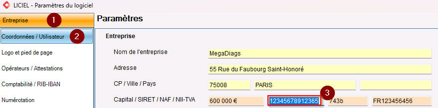 Allez sur le menu outil puis paramètre du logiciel, et ensuite saisir ici le Siret sans espace avec les 9 chiffres :
