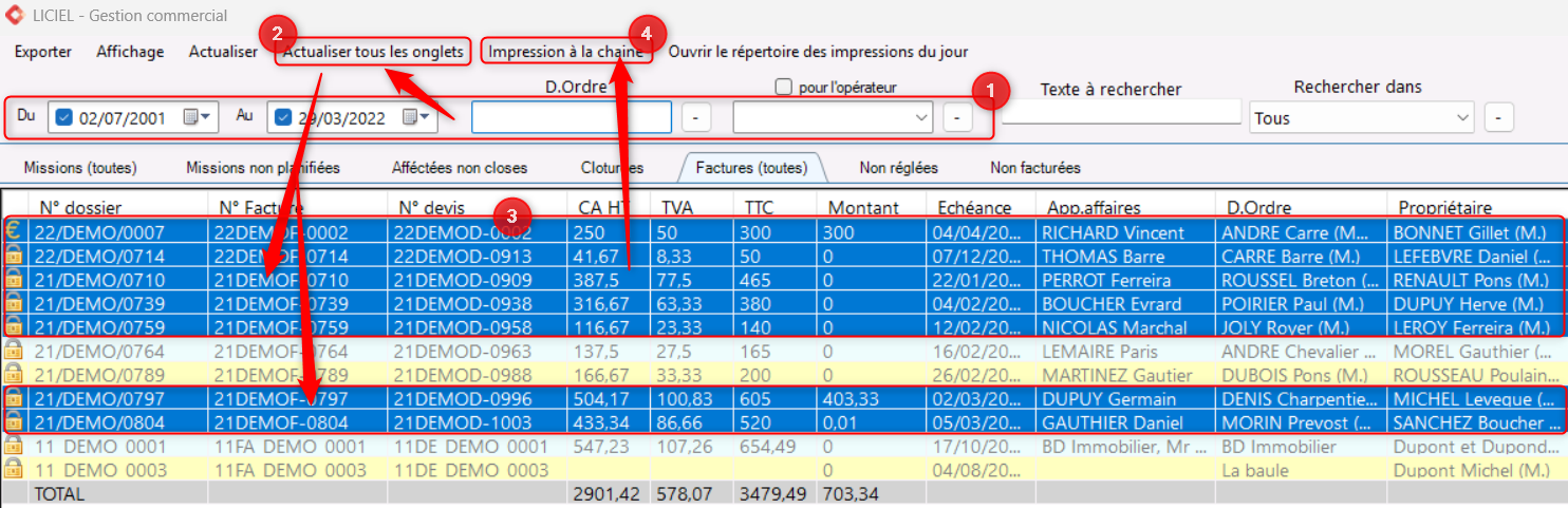 Puis aller dans l'onglet Factures (toute), sélectionner les factures que vous souhaitez imprimer (CTRL+A pour sélectionner toutes les lignes) ou (CTRL+ clic sur la ligne de la facture, souhaitez)