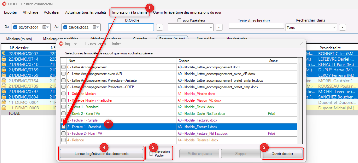 Ensuite sélectionner le modèle de facture à imprimer (impression papier possible en plus du Pdf en "3")