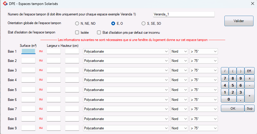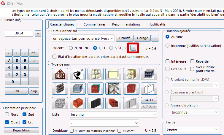 NB : il faut toujours indiquer chaque type de mur et non chaque pan de mur. L'ADEME souhaite maintenant avoir l'orientation non pas pour le calcul, mais pour des statistiques. Liciel s'appuie sur cette information pour éviter les oublis, donc même si l'information est facultative sur l'arrêté ; Liciel peut se baser sur ses infos pour calculer (par exemple, la ventilation).